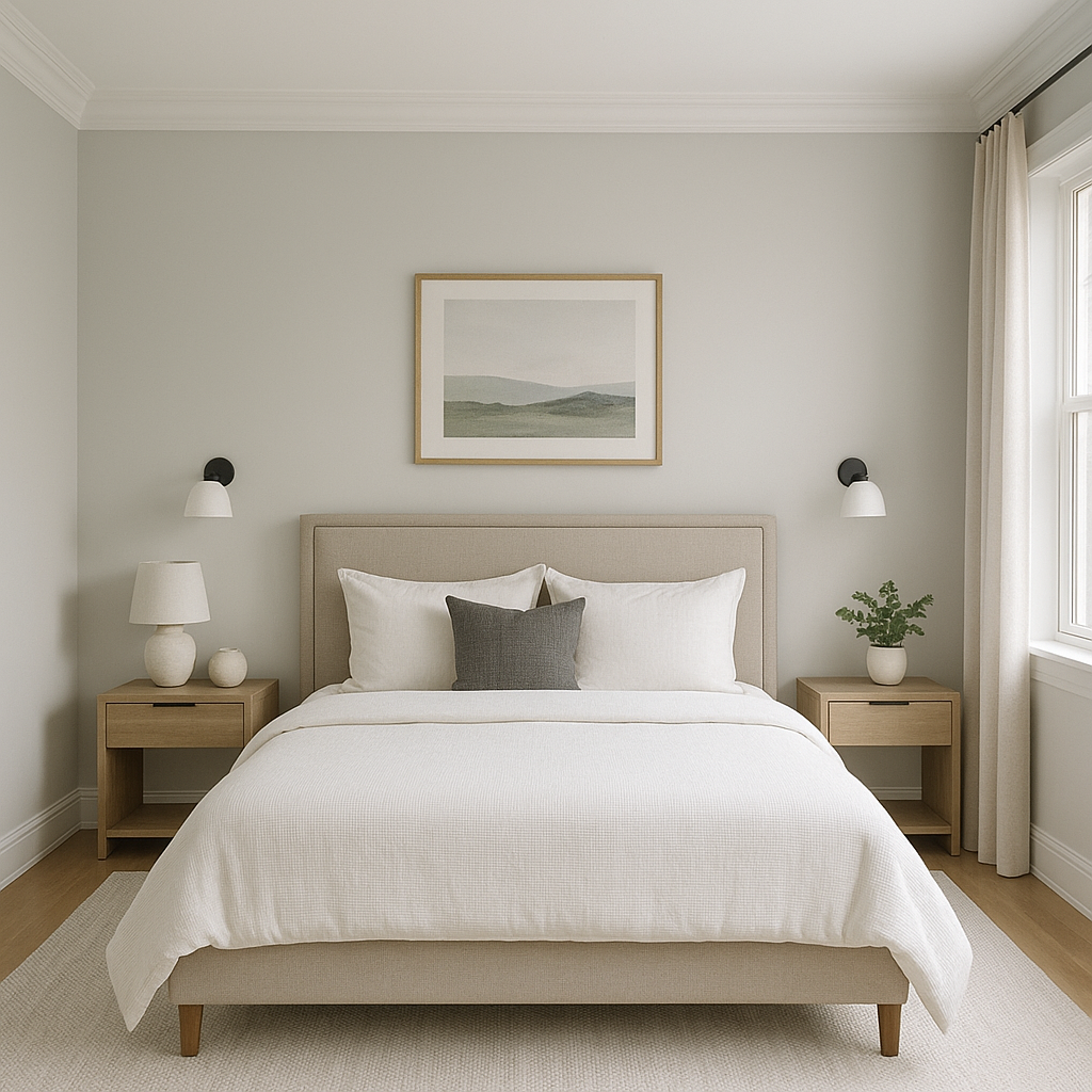 Benjamin Moore Chantilly Lace (OC-65): A bright, clean white that pairs effortlessly with Horizon for trim, ceiling, or cabinetry. This combination enhances Horizon's elegance while maintaining a fresh and modern feel.