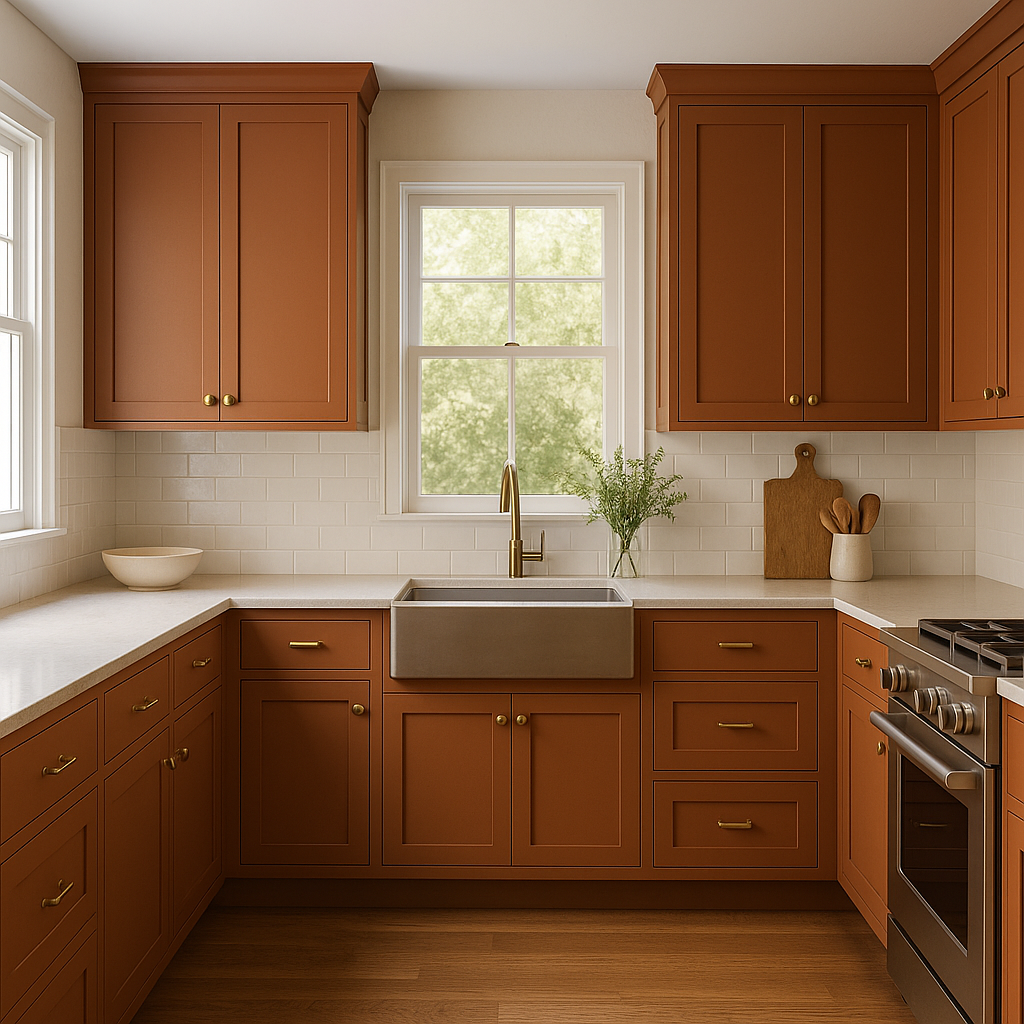 Rust is an excellent choice for kitchen cabinetry, particularly in spaces inspired by nature or vintage design. Combine it with brushed brass hardware and light-colored countertops for a luxurious yet approachable vibe.