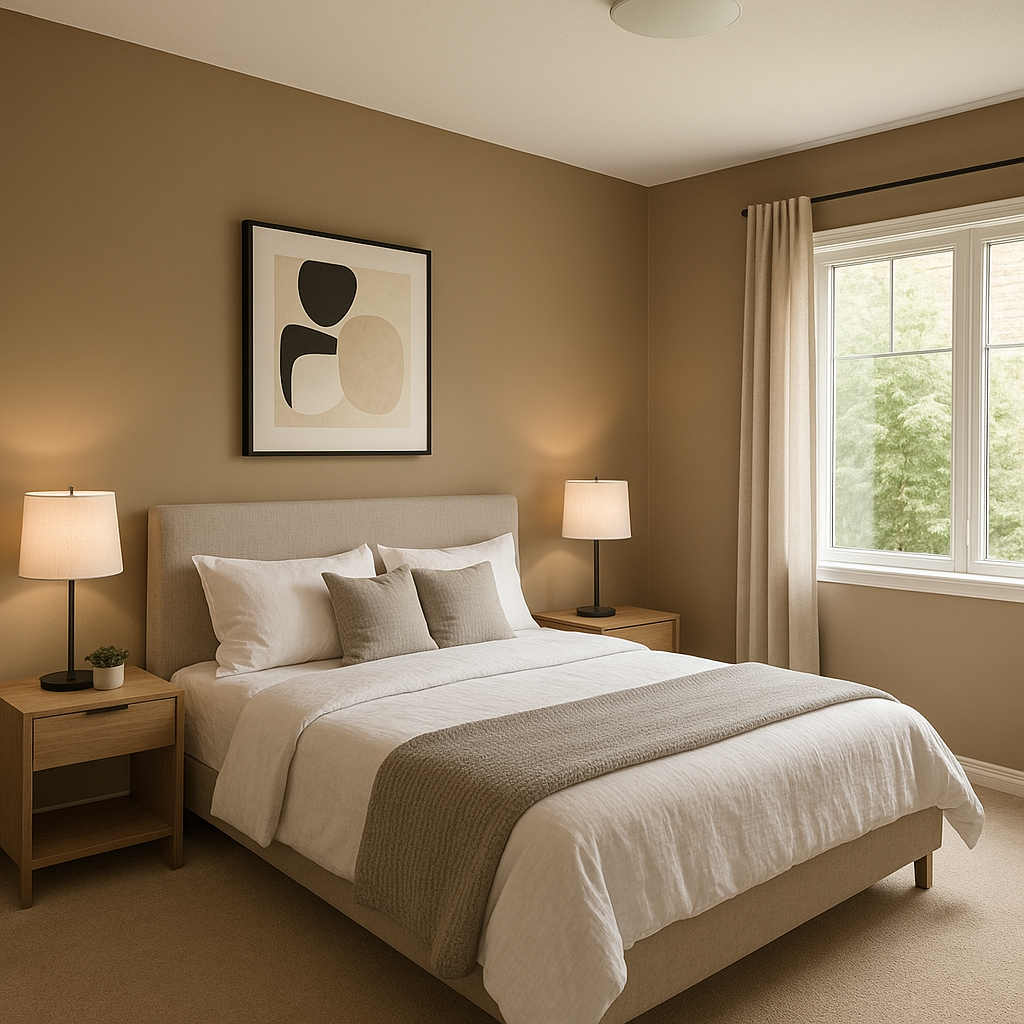 For a restful and serene bedroom, Quiver Tan provides a grounding backdrop that promotes relaxation. Pair it with crisp white bedding and soft green or blue accents for a calming, spa-like atmosphere.