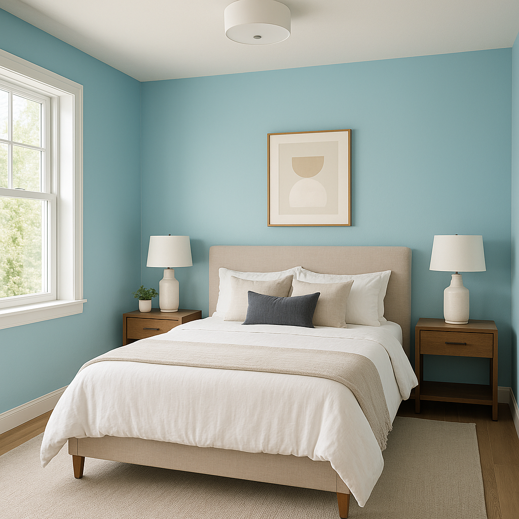 This shade of blue is ideal for bedrooms, as its calming nature promotes relaxation and tranquility. Combine it with soft white bedding and soothing accent colors like pale gray or aqua to create a restful retreat.