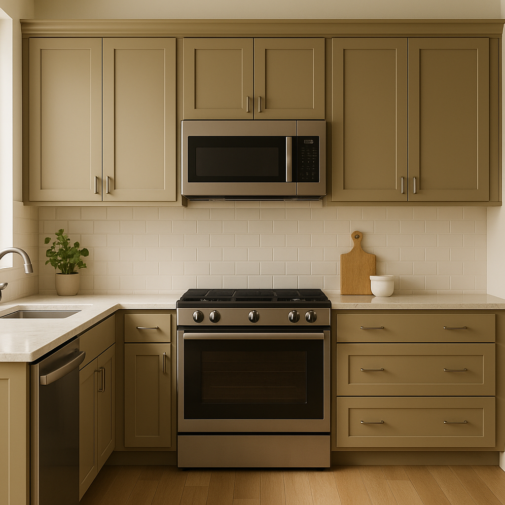Khaki Shade works beautifully in kitchens and dining areas, where its warm undertones create a welcoming environment. Pair it with white subway tiles, wood cabinetry, or black hardware for a modern farmhouse look.