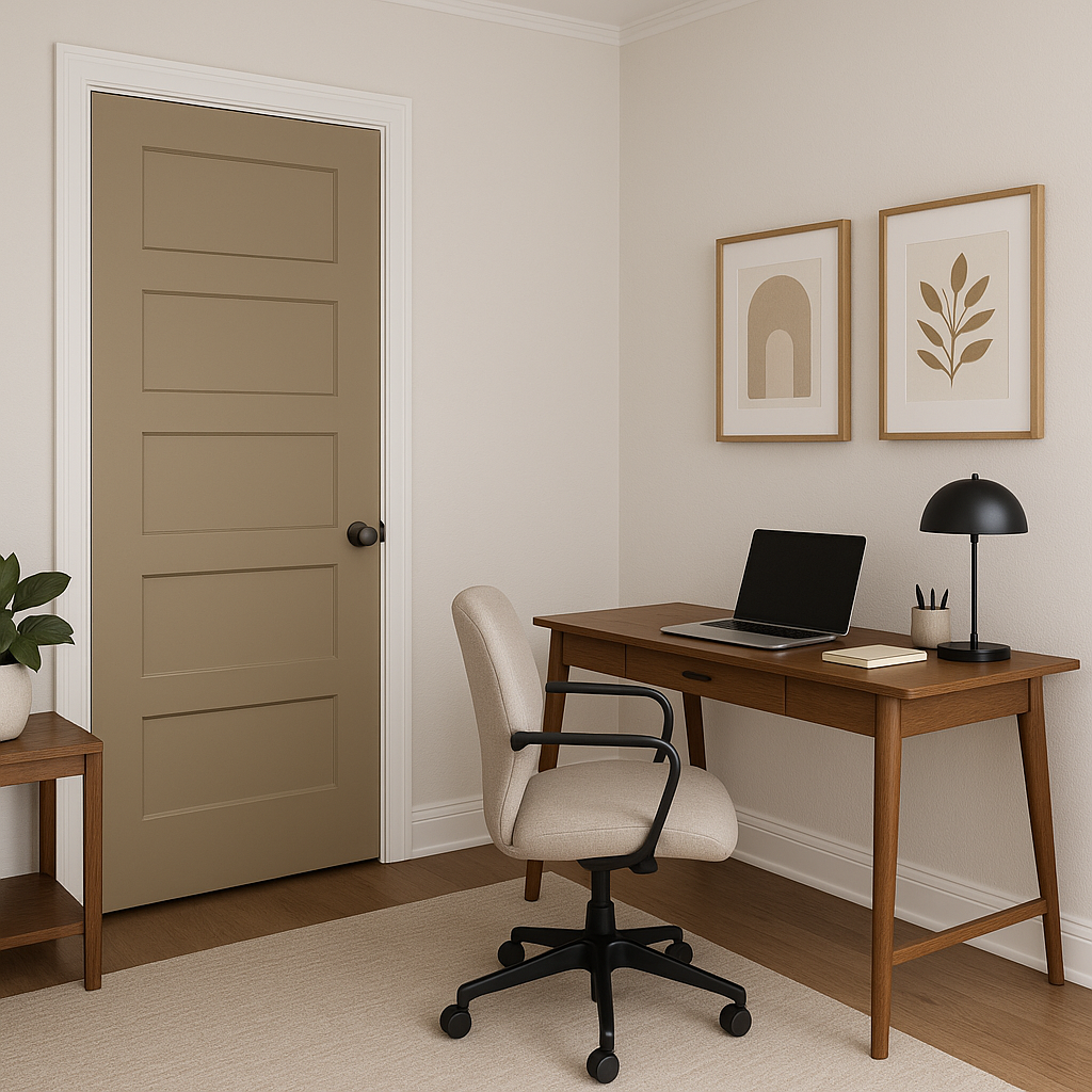 In a home office, Khaki Shade fosters focus and tranquility. Combine it with darker accent colors like Urbane Bronze or Tricorn Black for a sophisticated and grounded workspace.