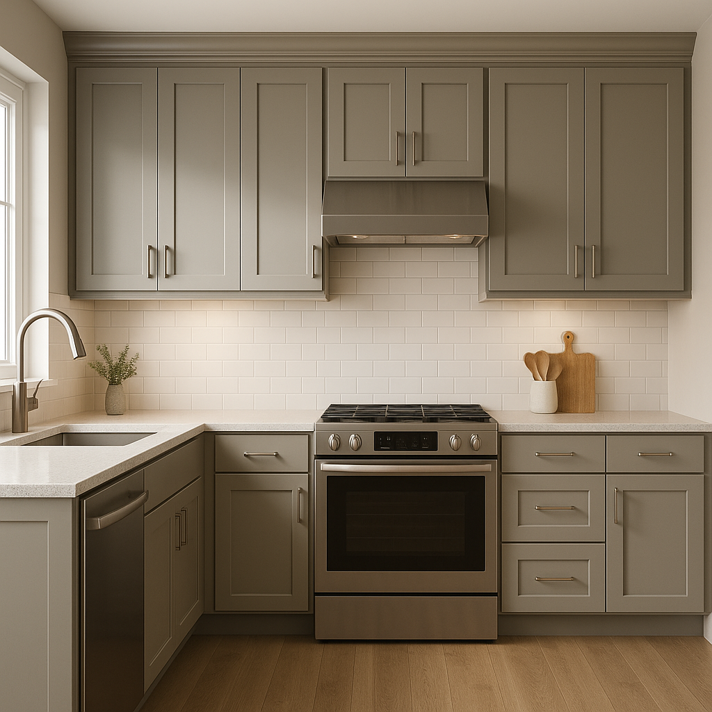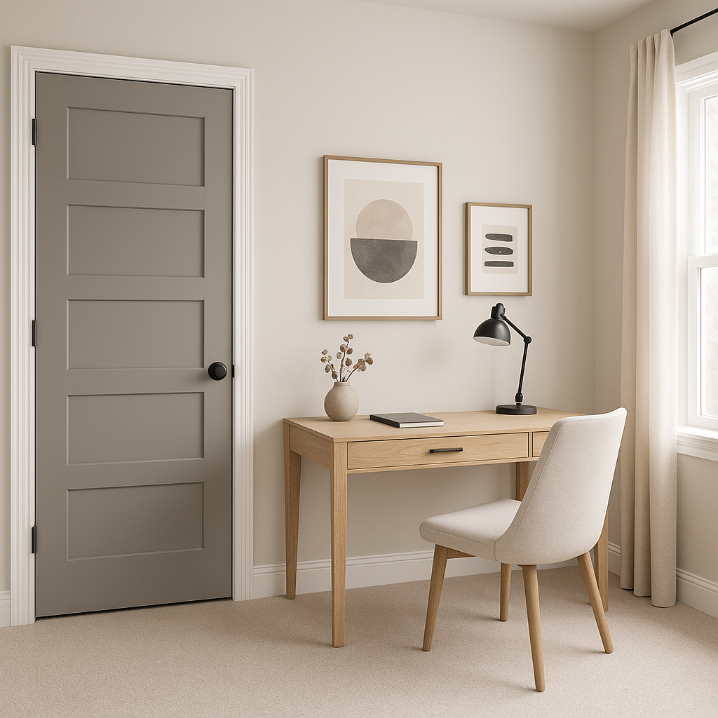 For kitchens and bathrooms, Stamped Concrete offers a clean, contemporary aesthetic. Use it on cabinetry for a sleek, modern look or as a wall color paired with glossy white subway tiles and stainless steel fixtures. Its cool undertones also complement marble or quartz countertops, creating a luxurious feel.
