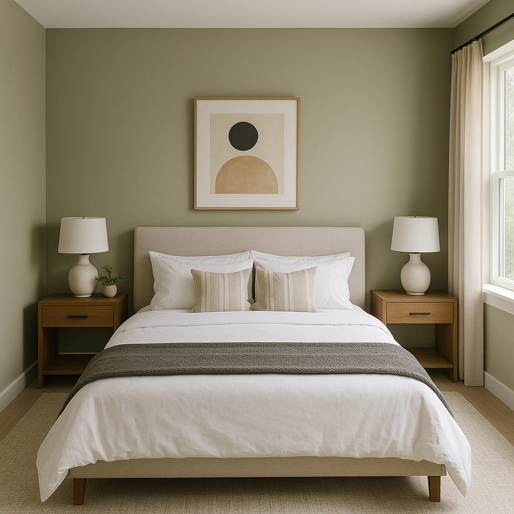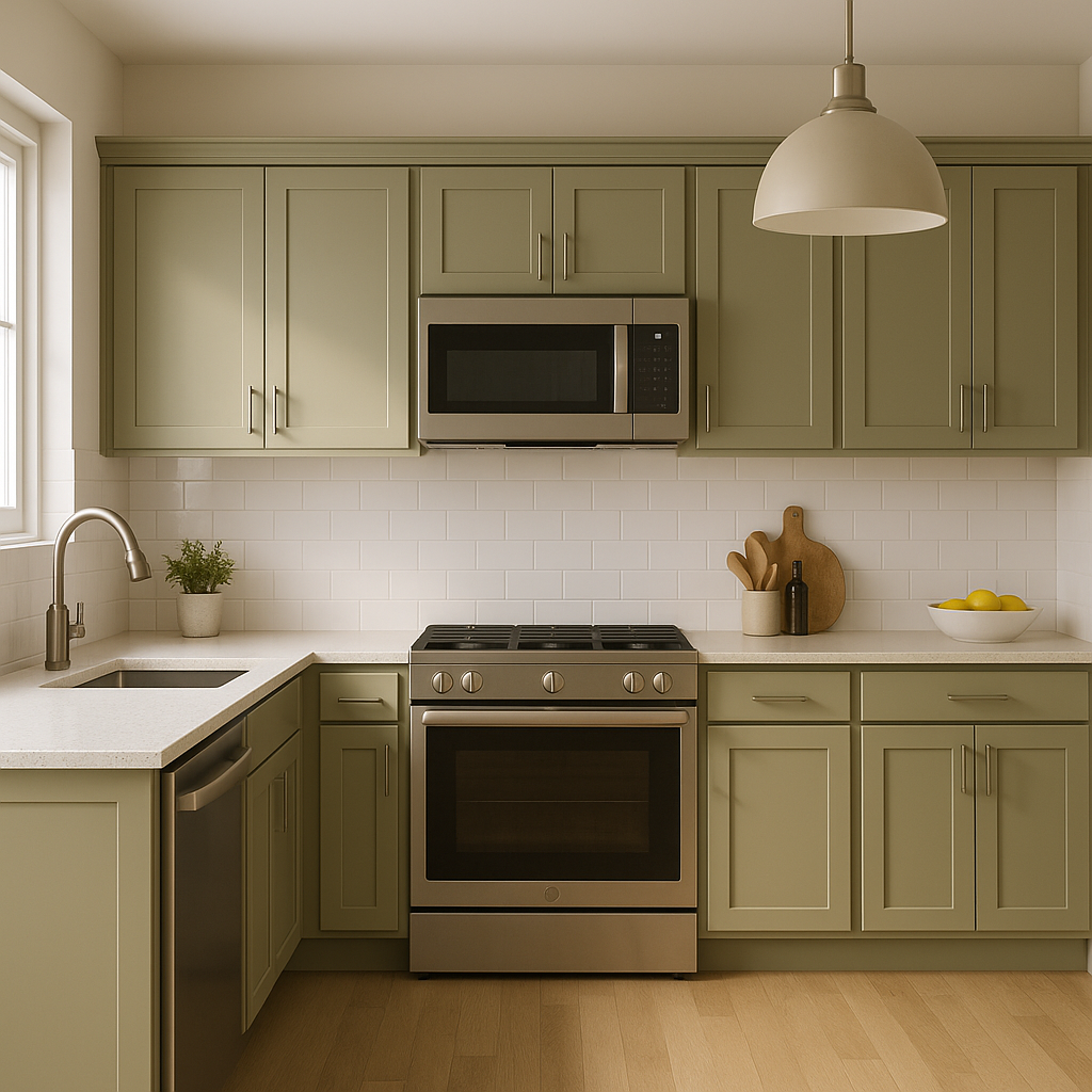 For a sophisticated yet earthy touch, use Koi Pond on cabinetry or islands. Its warm undertones pair beautifully with brass or copper hardware and natural stone countertops. Incorporate light neutrals like Shoji White on walls or trim to keep the space bright and balanced.