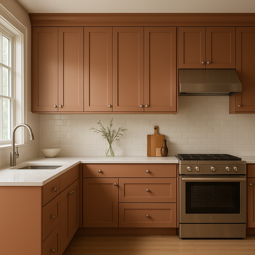 Hushed Auburn 9080’s versatility makes it a great choice for a wide range of applications across both residential and commercial spaces. Here are some ideas for incorporating this warm and inviting shade into your design: