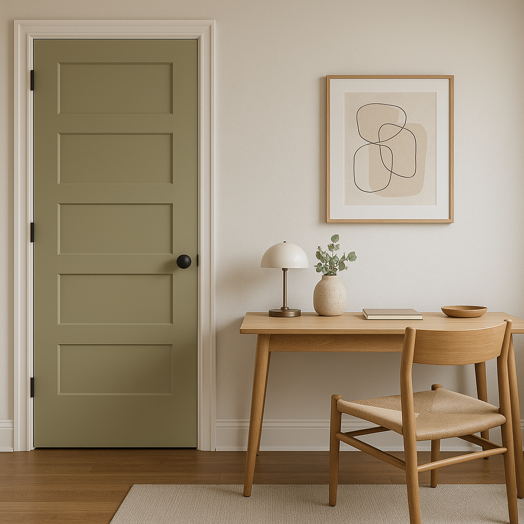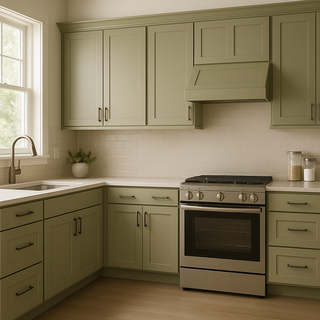 This olive green works beautifully on cabinetry, especially when paired with marble or quartz countertops. Add brushed gold or black hardware for a modern touch.