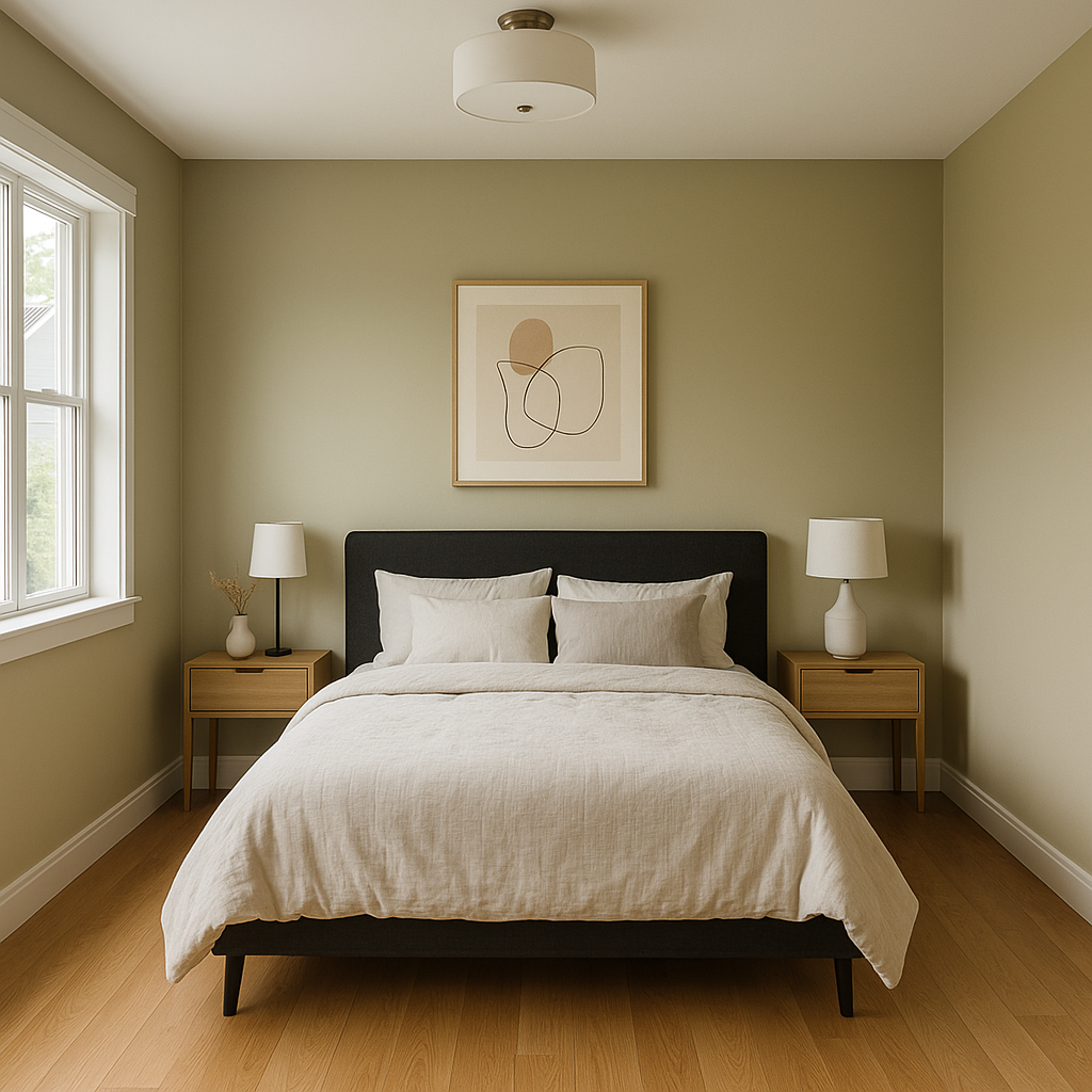 For a serene retreat, paint the walls Dirty Martini and layer in creamy whites and soft gray textiles. Add pops of navy or mustard yellow for a subtle contrast.